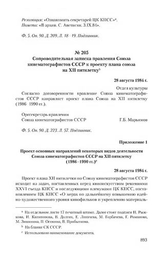 Сопроводительная записка правления Союза кинематографистов СССР к проекту плана союза на XII пятилетку. 28 августа 1984 г. // Ф. 5. Оп. 90. Д. 223. Л. 57. Подлинник.