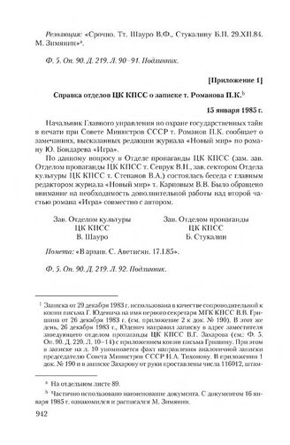Приложение к информации Главлит СССР от 29 декабря 1984 г. Справка отделов ЦК КПСС о записке т. Романова П.К. 15 января 1985 г.