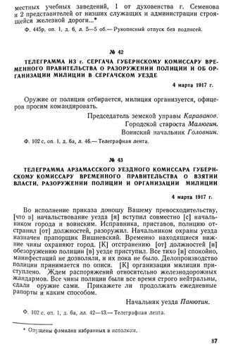 Телеграмма из г. Сергача губернскому комиссару Временного правительства о разоружении полиции и об организации милиции в Сергачском уезде. 4 марта 1917 г.
