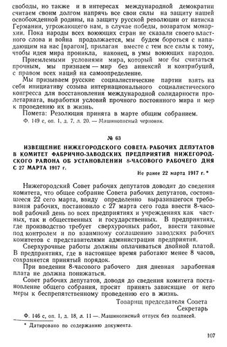 Извещение Нижегородского Совета рабочих депутатов в Комитет фабрично-заводских предприятий Нижегородского района об установлении 8-часового рабочего дня с 27 марта 1917 г. не ранее 22 марта 1917 г.