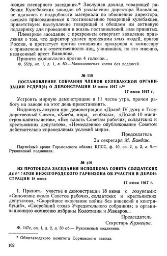Из протокола заседания исполкома Совета солдатских депутатов Нижегородского гарнизона об участии в демонстрации 18 июня. 17 июня 1917 г. // Ф. 147 с, оп. 1, д. 2, л. 50 об. — Рукописный подлинник.