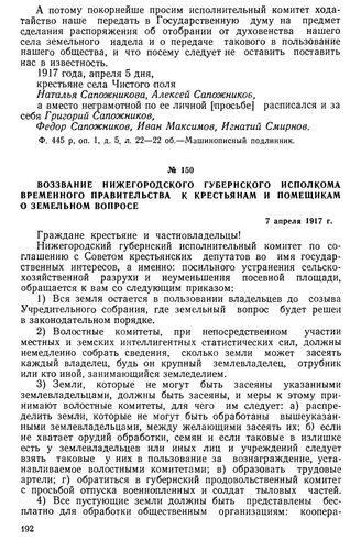 Воззвание Нижегородского губернского исполкома Временного правительства к крестьянам и помещикам о земельном вопросе. 7 апреля 1917 г. // Ф. 420 с, оп. 1, д. 63, л. 47—47 об. — Машинописная копия без подписей.