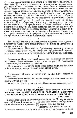 Телеграмма Нижегородского Временного комитета Московскому Совету рабочих и солдатских депутатов с просьбой не допускать отправки войск в Н. Новгород. 5 июля 1917 г.