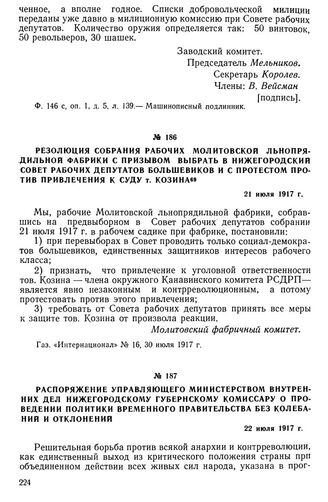 Распоряжение управляющего Министерством внутренних дел нижегородскому губернскому комиссару о проведении политики Временного правительства без колебаний и отклонений. 22 июля 1917 г. // Ф. 3038 р. оп. 1, д. 9, л. 30. — Типографский экземпляр.