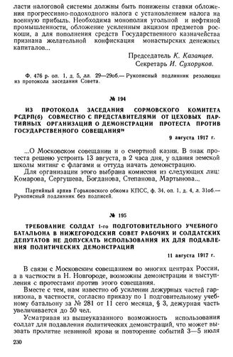 Из протокола заседания Сормовского комитета РСДРП(б) совместно с представителями от цеховых партийных организаций о демонстрации протеста против государственного совещания. 9 августа 1917 г.