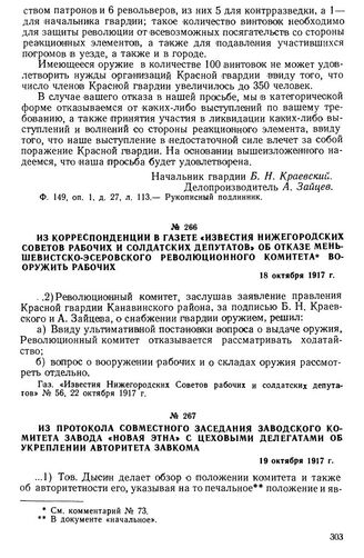 Из корреспонденции в газете «Известия Нижегородских Советов рабочих и солдатских депутатов» об отказе меньшевистско-эсеровского революционного комитета вооружить рабочих. 18 октября 1917 г. // Газ. «Известия Нижегородских Советов рабочих и солдатских депутатов» № 56, 22 октября 1917 г.