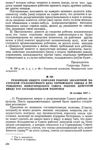Резолюция общего собрания рабочих закалочной мастерской сталелитейного цеха Сормовского завода о перевыборах Нижегородского Совета рабочих депутатов ввиду его соглашательской политики. 20 октября 1917 г. // Ф. 552р, оп. 2, д. 40, л. 6—6 об. — Рукописный подлинник.