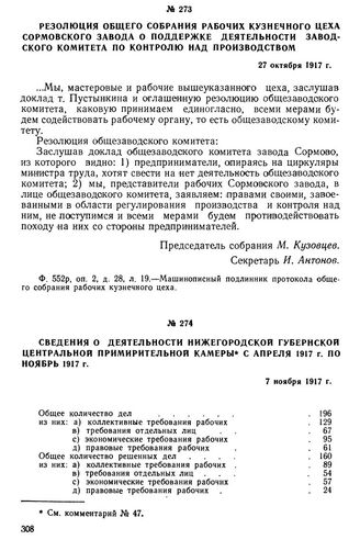 Резолюция общего собрания рабочих кузнечного цеха Сормовского завода о поддержке деятельности заводского комитета по контролю над производством. 27 октября 1917 г. // Ф. 552р, оп. 2, д. 28, л. 19. — Машинописный подлинник.