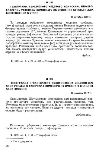 Телеграмма сергачского уездного комиссара нижегородскому уездному комиссару об усилении крестьянских выступлении в уезде. 10 октября 1917 г.