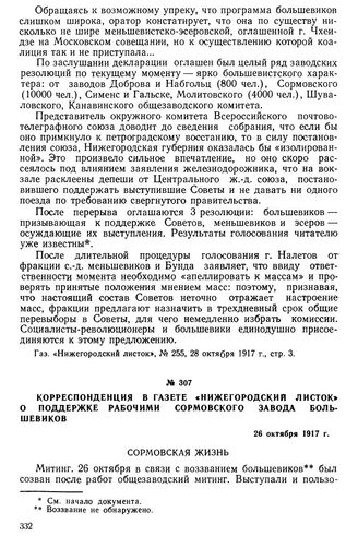 Корреспонденция в газете «Нижегородский листок» о поддержке рабочими Сормовского завода большевиков. 26 октября 1917 г. // Газ. «Нижегородский листок» № 257, от 1 ноября 1917 г., стр. 3.