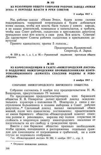 Из корреспонденции в газете «Нижегородский листок» о поддержке нижегородскими промышленниками контрреволюционного «Комитета спасения Родины и революции». 3 ноября 1917 г. // Газ. «Нижегородский листок» № 260, 4 ноября 1917 г., стр. 3.