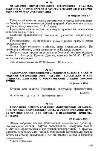 Обращение Нижегородского губернского комитета РСДРП(б) к членам партии и сочувствующим ей о сформировании отряда добровольцев. 28 февраля 1918 г.