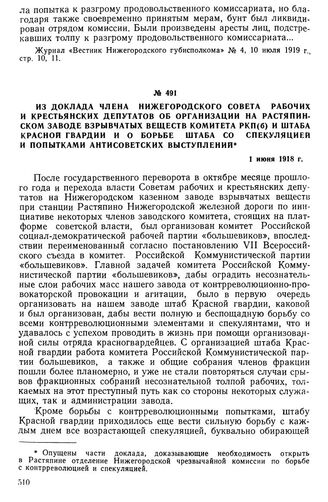Из доклада члена Нижегородского Совета рабочих и крестьянских депутатов об организации на Растяпинском заводе взрывчатых веществ Комитета РКП(б) и штаба Красной гвардии и о борьбе штаба со спекуляцией и попытками антисоветских выступлении. 1 июня ...