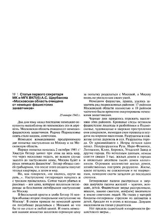 Статья первого секретаря МК и МГК ВКП(б) А.С. Щербакова «Московская область очищена от немецко-фашистских захватчиков». 25 января 1942 г.