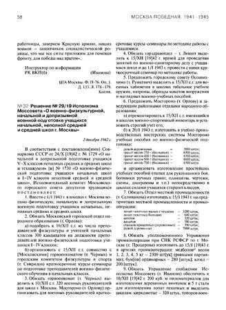 Решение № 29/19 Исполкома Моссовета «О военно-физкультурной, начальной и допризывной военной подготовке учащихся начальной, неполной средней и средней школ г. Москвы». 2 декабря 1942 г.