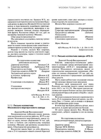 Письма трудящихся г. Москвы председателю ГКО СССР И.В. Сталину о сборе средств для усиления технической и материальной помощи фронту. Письмо коллектива завода «АТЭ-2». Январь 1943 г.