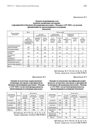 Приложение № 1 к постановлению № 846 СНК РСФСР от 20 ноября 1942 г. Задание по расширению сети ремонтно-починочных мастерских и предприятий по бытовому обслуживанию населения г. Москвы к 1/IV 1943 г. по местной промышленности, промкооперации и кооперации инвалидов // ЦГА Москвы. Ф. Р-150. Оп. 24. Д. 4 в. Л. 80. Копия.