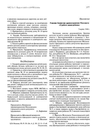Приложение к решению объединенного заседания Комиссии здравоохранения и Школьной комиссии Моссовета от 7 марта 1944 г. Решение Комиссии здравоохранения Моссовета «О работе домов ребенка». 7 марта 1944 г.