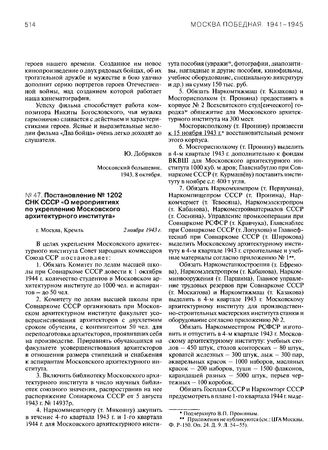 Постановление № 1202 СНК СССР «О мероприятиях по укреплению Московского архитектурного института». 2 ноября 1943 г.