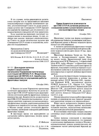 Приложение к докладной записке первого заместителя начальника Управления пропаганды и агитации ЦК ВКП(б) П.Н. Федосеева от 8 декабря 1944 г. Приказ Комитета по делам искусств при СНК СССР об улучшении руководства и повышении идейно-художественного качества спектаклей фронтовых театров. 10 ноября 1944 г. // РГАСПИ. Ф. 17. Оп. 125. Д. 297. Л. 93-95. Заверенная копия.