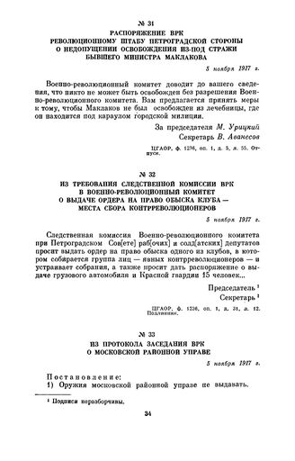 Из протокола заседания ВРК о Московской районной управе. 5 ноября 1917 г. // ЦГАОР, ф. 1236, оп. 1, д. 1, л. 49 об. Черновик.