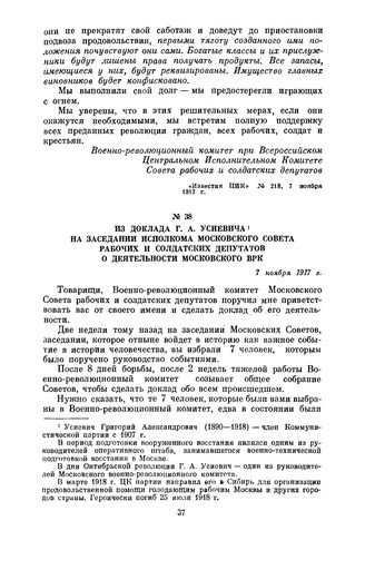 Из доклада Г.А. Усиевича на заседании исполкома Московского Совета рабочих и солдатских депутатов о деятельности Московского ВРК. 7 ноября 1917 г.