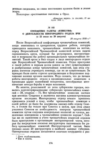 Сообщение газеты «Известия» о деятельности иногороднего отдела ВЧК (с 23 июля по 20 августа). 28 августа 1918 г.