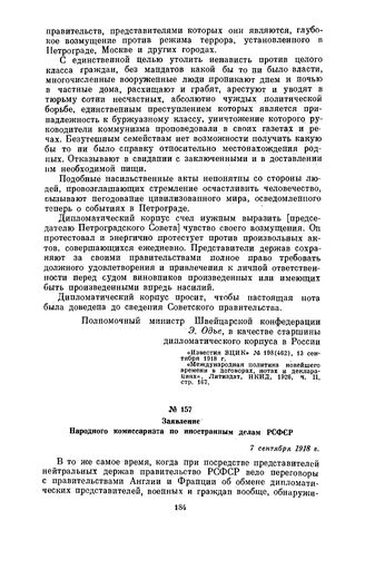 Дипломатическая переписка Наркоминдела с дипломатическими представителями капиталистических держав о белом и красном терроре. Заявление Народного комиссариата по иностранным делам РСФСР. 7 сентября 1918 г. // «Правда» № 191, 7 сентября 1918 г. «Международная политика новейшего времени в договорах, нотах и декларациях», ч. II, стр. 170—171.