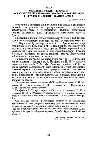 Сообщение газеты «Известия» о раскрытии МЧК контрреволюционной организации в органах снабжения Красной Армии. 13 июня 1920 г.