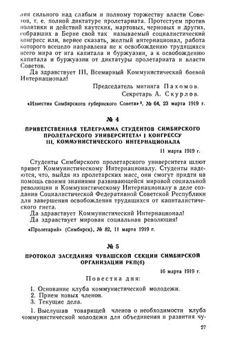 Приветственная телеграмма студентов Симбирского пролетарского университета I Конгрессу III, коммунистического интернационала. 11 марта 1919 г. // «Пролетарий» (Симбирск), № 82, 11 марта 1919 г.