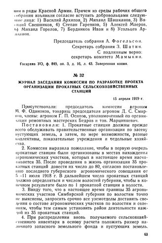 Журнал заседания комиссии по разработке проекта организации прокатных сельскохозяйственных станций. 15 апреля 1919 г. // Госархив УО, ф. 336, оп. 42, д. 54, лл. 5—6. Заверенная копия.