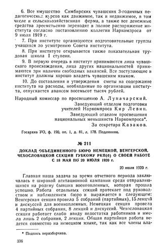Доклад объединенного бюро немецкой, венгерской, чехословацкой секций губкому РКП(б) о своей работе с 18 мая по 20 июля 1920 г. 20 июля 1920 г. // Партархив УО, ф. 1, оп. 1, д. 354, л. 129. Подлинник.