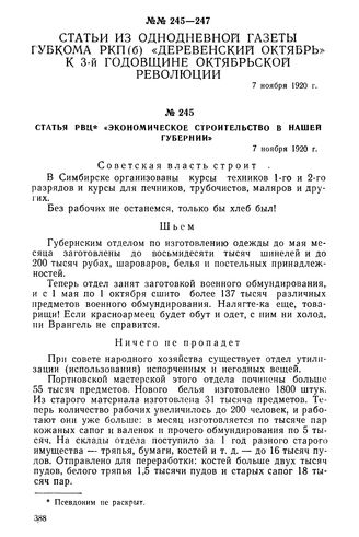 Статьи из однодневной газеты губкома РКП(б) «Деревенский Октябрь» к 3-й годовщине Октябрьской революции. Статья РВЦ «Экономическое строительство в нашей губернии». 7 ноября 1920 г. // «Деревенский Октябрь» (г. Симбирск), 7 ноября 1920 г.