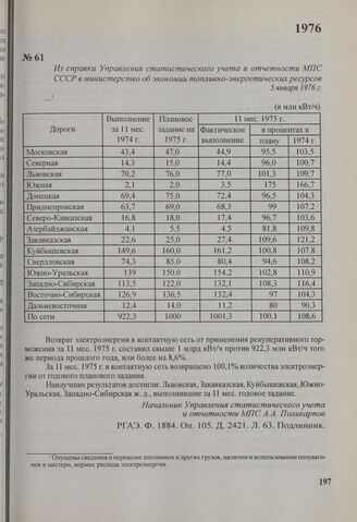 Из справки Управления статистического учета и отчетности МПС СССР в министерство об экономии топливно-энергетических ресурсов. 5 января 1976 г. // РГАЭ. Ф. 1884. Оп. 105. Д. 2421. Л. 63. Подлинник.