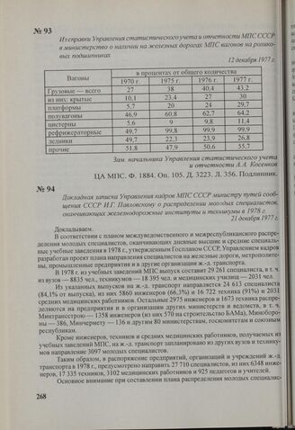 Из справки Управления статистического учета и отчетности МПС СССР в министерство о наличии на железных дорогах МПС вагонов на роликовых подшипниках. 12 декабря 1977 г. // ЦА МПС. Ф. 1884. Оп. 105. Д. 3223. Л. 356. Подлинник.