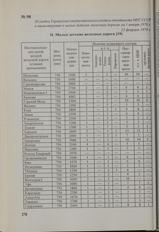 Из сводки Управления статистического учета и отчетности МПС СССР в министерство о малых детских железных дорогах на 1 января 1978 г. 22 февраля 1978 г. // ЦА МПС. Ф. 1884. Оп. 105. Д. 3960. Л. 120 об. Подлинник.