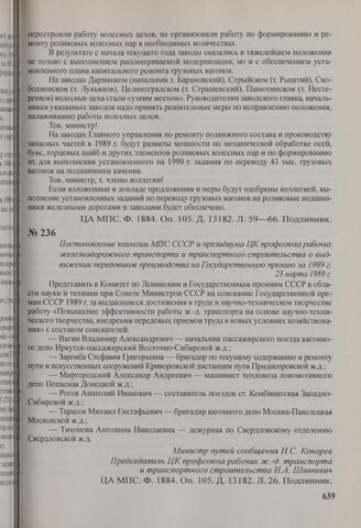 Постановление коллегии МПС СССР и президиума ЦК профсоюза рабочих железнодорожного транспорта и транспортного строительства о выдвижении передовиков производства на Государственную премию за 1989 г. 23 марта 1989 г. // ЦА МПС. Ф. 1884. Оп. 105. Д. 13182. Л. 26. Подлинник.