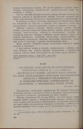 Обращение комсомольско-молодежных тракторных бригад № 1, № 9 совхоза «Железнодорожный» Октябрьского района ко всем молодежным бригадам Кустанайской области с призывом включиться в социалистическое соревнование за получение 11 млрд, пудов зерна. 25 марта 1956 г. // Кустанайский обком ЛКСМ Казахстана. Подлинник.
