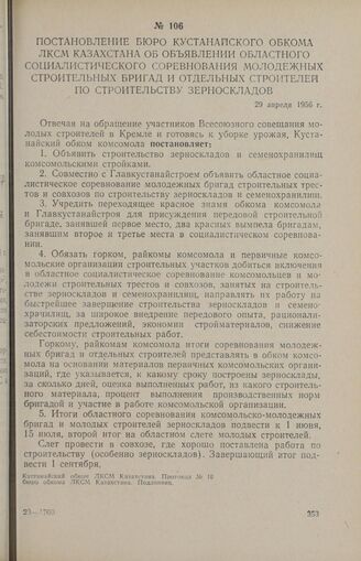 Постановление бюро Кустанайского обкома ЛКСМ Казахстана об объявлении областного социалистического соревнования молодежных строительных бригад и отдельных строителей по строительству зерноскладов. 29 апреля 1956 г.