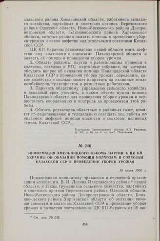 Информация Хмельницкого обкома партии в ЦК КП Украины об оказании помощи колхозам и совхозам Казахской ССР в проведении уборки урожая. 10 июня 1960 г.