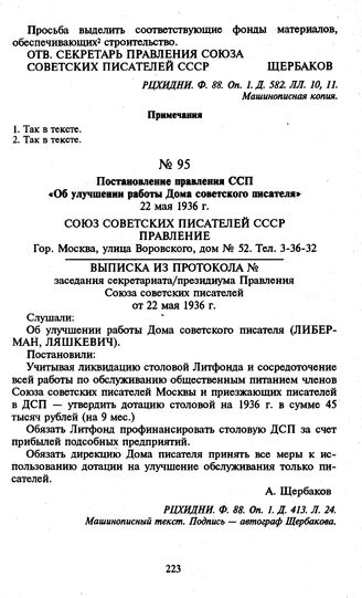 Докладная записка правления ССП «Об улучшении работы Дома советского писателя». 22 мая 1936 г. // РЦХИДНИ. Ф. 88. Oп. 1. Д. 413. Л. 24. Машинописный текст. Подпись — автограф Щербакова.