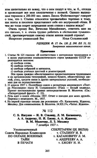 С.Б. Ингулов — И.В. Сталину, Л.М. Кагановичу, А.А. Андрееву, Н.И. Ежову, А.А. Жданову, В.М. Молотову, Л.З. Мехлису. 7 декабря 1937 г. // РЦХИДНИ. Ф. 82. Оп. 2. Д. 990. ЛЛ. 66, 67. Машинописный текст. Подпись — автограф Ингулова.