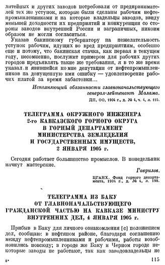 Телеграмма из Баку от главноначальствующего гражданской частью на Кавказе министру внутренних дел, 4 января 1905 г. // ДП, ОО, 1904 г., д. № 4, ч. 4, л. 104.