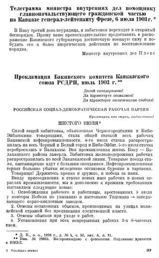 Телеграмма министра внутренних дел помощнику главноначальствующего гражданской частью на Кавказе генерал-лейтенанту Фрезе, б июля 1903 г. // Д. П., о. о., 1898 г., д. № 4 ч. 50, лит. А, л. 11.