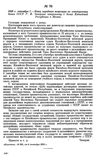 Главная Советско-китайские отношения. 1917-1957 Документы 1926 г. сентября 7. — Нота народного комиссара по иностранным делам...