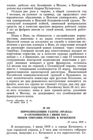 Корреспонденция газеты «Правда» о состоявшемся 1 июня 1919 г. общем собрании русских в Кечкемете. 12 июня 1919 г.