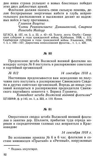 Предписание штаба Волжской военной флотилии командиру катера № 8 поступить в распоряжение советских и партийной организаций. 14 сентября 1918 г. // ЦГАВМФ, ф. р-143, оп. 1, д. 223, л. 110. Копия.