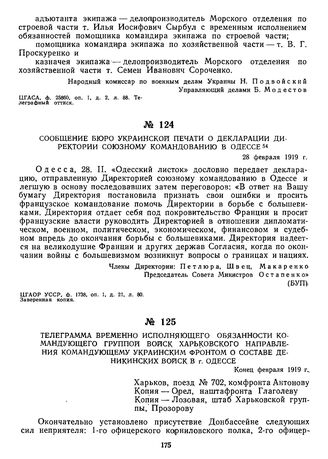 Телеграмма временно исполняющего обязанности командующего группой войск Харьковского направления командующему Украинским фронтом о составе деникинских войск в г. Одессе. Конец февраля 1919 г.