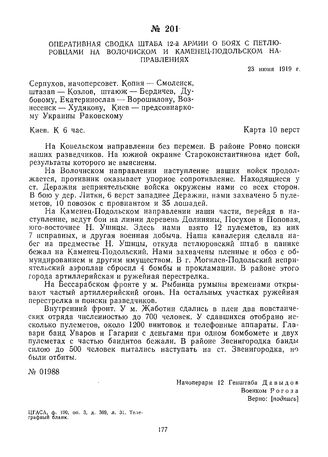 Оперативная сводка штаба 12-й армии о боях с петлюровцами на Волочиском и Каменец-Подольском направлениях. 23 июня 1919 г.