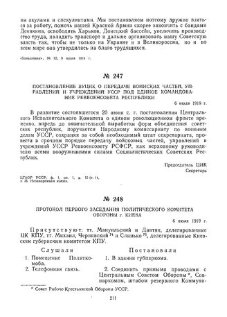 Протокол первого заседания Политического комитета обороны г. Киева. 6 июля 1919 г.